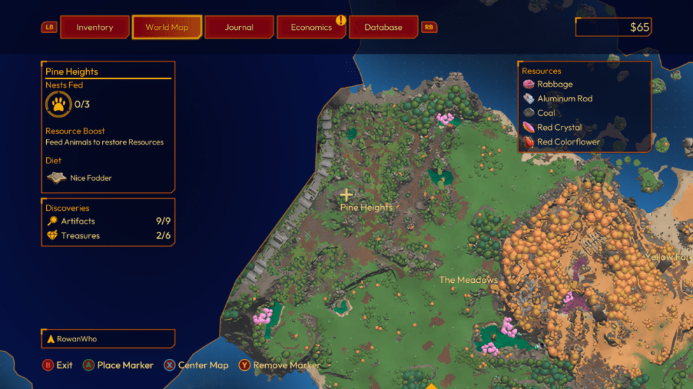 Once you have cleaned Pine Heights entirely, every resource and creature nest will be available for you to harvest or feed. Explore the whole area to see what you can find! Now when you open the World Map via your menu you can hover over Pine Heights and see the resources available to harvest.