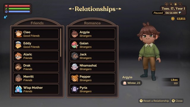 You can view how your relationship with each romantic partner is progressing by opening your ‘Relationships’ menu. There, you’ll find a full list of each character you can date in Fae Farm, regardless of whether you’ve started to court them or not.