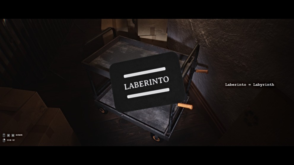 This time, go through the hallway straight ahead, pass the chair, where you’ll see a previously locked room open on the left. Inside, you’ll see three cloaked figures standing in the back, with a space noting one missing. Pick up the FANTASMA Card lying on the cardboard while you’re there.
