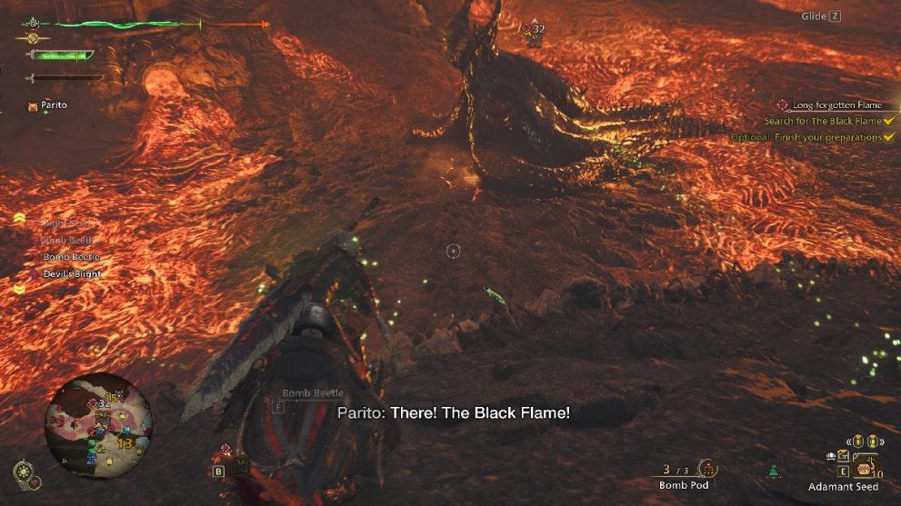 Find and interact with the tar-like gooey puddle on the floor here. Your Scoutflies will be able to track the scent and lead you straight to The Black Flame down the Pit Elevators. Now follow the trail towards the Apex Predator Nu Udra who awaits you in a pit full of lava. Be prepared, because this is one of the tougher fights in Monster Hunter Wilds’ campaign.