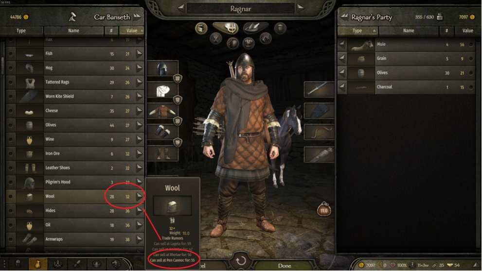 In our case, we found that Car Banseth always has items a bit cheaper than elsewhere. So, all you need to do is visit the town, access the trade menu, list items by price, and then look to see which ones sell for more elsewhere. Choose items that have a decent profit margin. As pictured below.