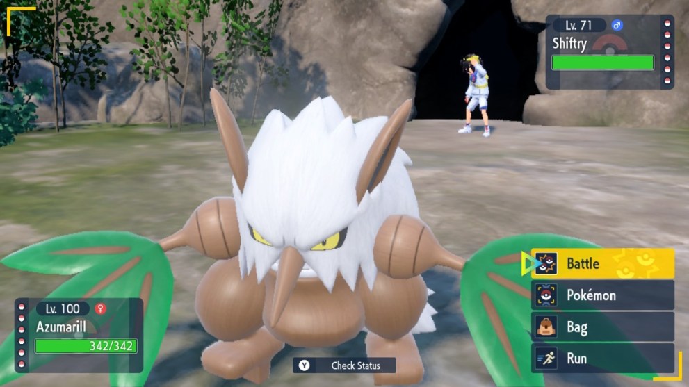 Kieran kicks off the fight with a Level 72 Shiftry. Shiftry is a Grass and Dark type Pokemon specializing in speed and offense to compensate for its poor defenses. Specifically, Shiftry is weak to Fairy, Fire, Flying, Bug, and Fighting type moves. There are plenty of ways to take this Pokemon down, so choose one of the above-listed types, each of which is super effective against this part of Kieran’s squad, to get the match started.