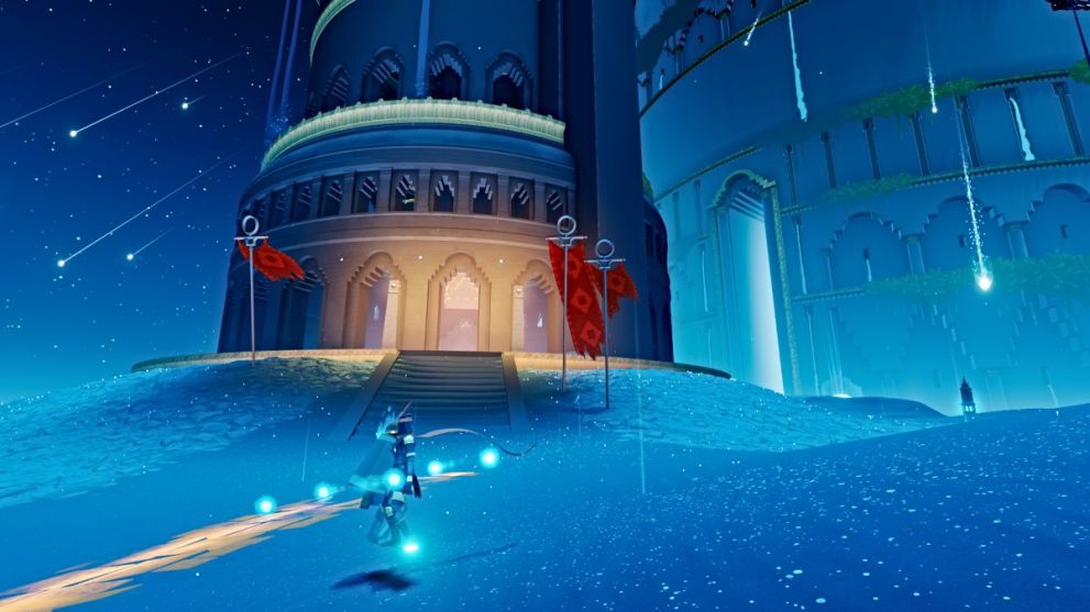 When you’re ready, head over to the circle of lanterns nearby and light them up to open the giant doors to the temple on the cliffs ahead. Use the ramp ledges to reach the temple itself and head inside.