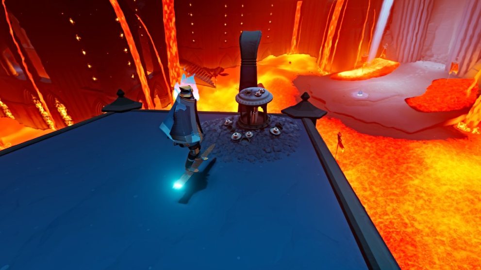 This is where the game immediately starts you off, taking you through a simple tutorial of how to “surf” atop the sword. Head through the temple while learning how to turn and jump. Once across the gap, interact with the contraption ahead to open the gate.