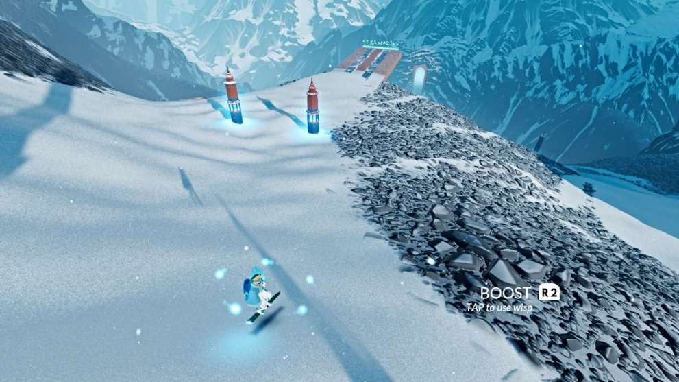 Eventually, you’ll reach the next area, with a mountain in the distance. As you ride through the pairs of pillars ahead, they’ll grant you Boost Wisps. You can use these to give yourself a speed boost.