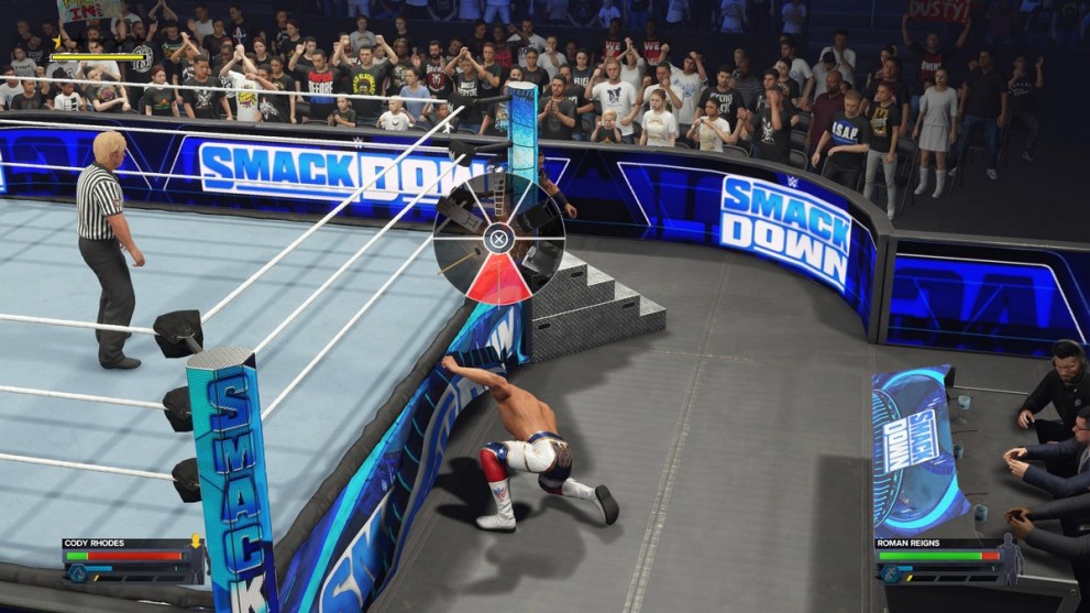 With the weapon in hand, it is now time to find a target of your ire. Face the general direction of the opponent, and press Circle/B to throw the weapon at them. When it connects, the other wrestler will be staggered from the hit, opening them up for further combos to hopefully end the fight. The opponent doesn’t even need to be standing; even those lying down can be hurt by a precise throw, so experiment with this new feature to find the sweet spot of some assisted damage.