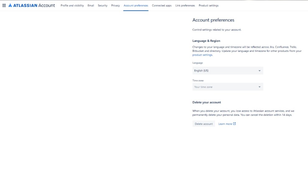 - Select the ‘Manage or delete your Atlassian account‘ option.