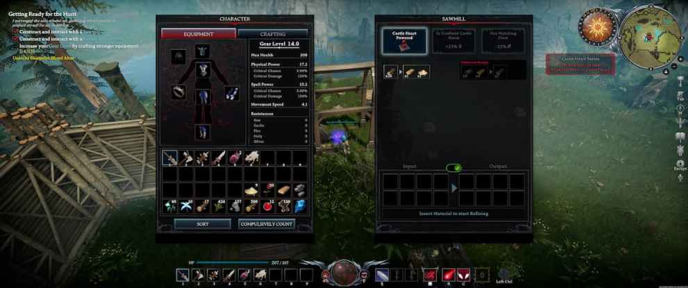 Everything in your base is powered with blood from the Castle Heart. Your Sawmill won’t work unless the Castle Heart is powered up, so interact with the Heart and input some Blood Essence to keep things running.