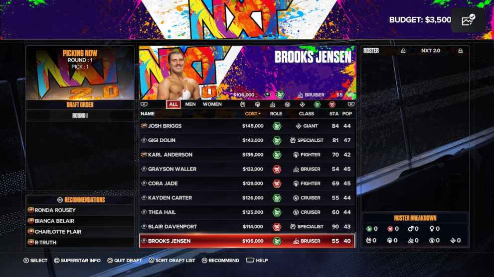 Before drafting, players can customize their superstar pool, pick between one and three opponents to battle against, set initial budgets, and confirm a difficulty setting. From there, it’s on to the draft, which brings us to our first tip.