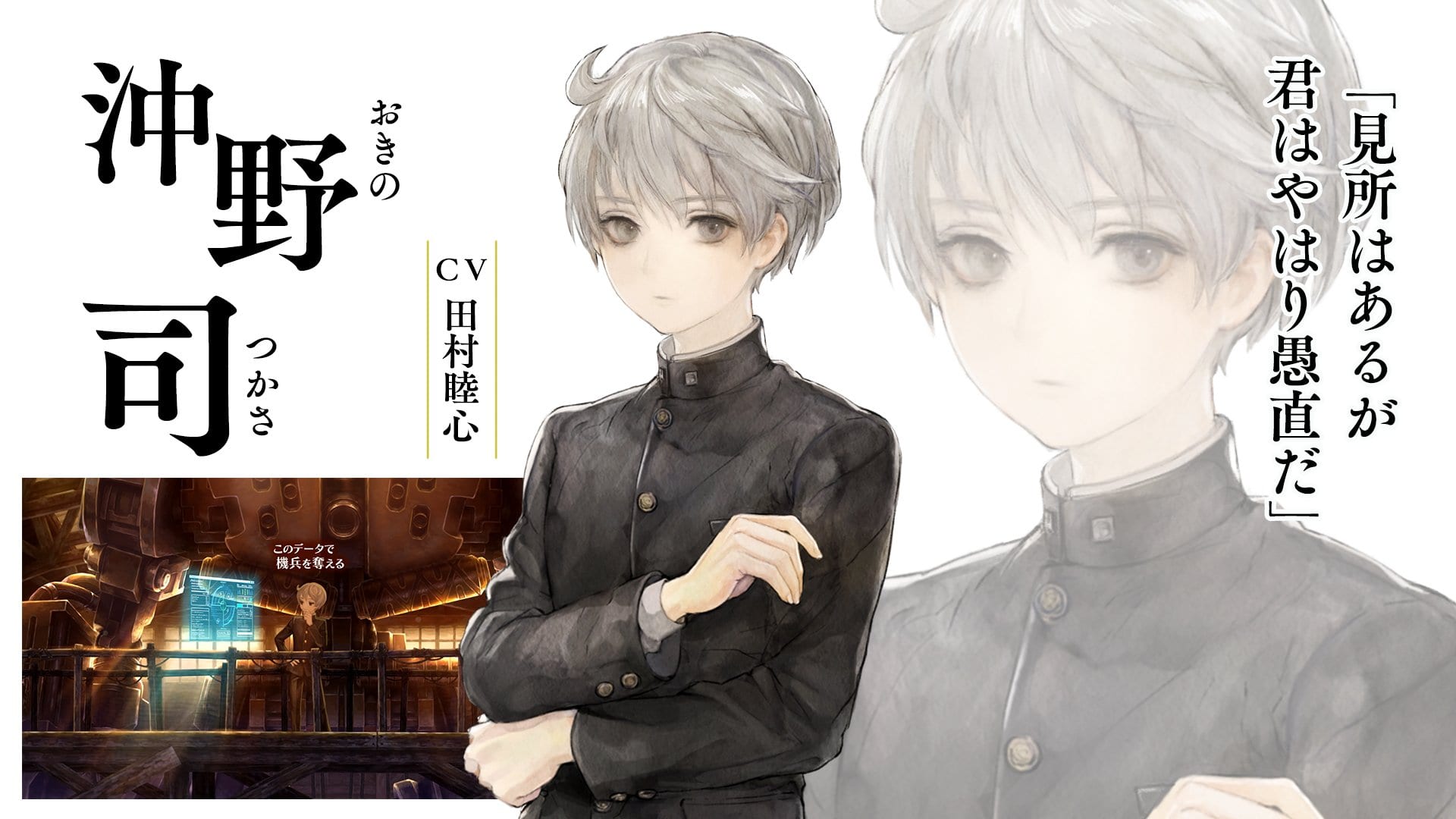 Tsukasa Okino is a genius high school student with an extremely high IQ. He created a variety of tech including the game’s mecha.