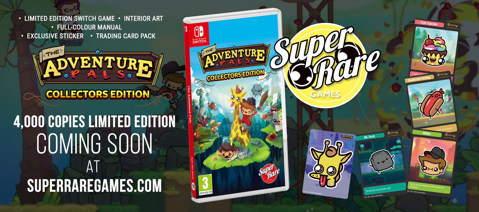The physical Super Rare edition of the game will come with a 20-page full-color manual, interior artwork, exclusive sticker, and three trading cards randomly selected from a five-card set.