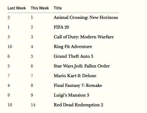 Call of Duty: Modern Warfare completes the top-three followed by Ring Fit Adventure, which is obviously rather suitable for times of quarantine. Its sales increased by 95% week-over-week.