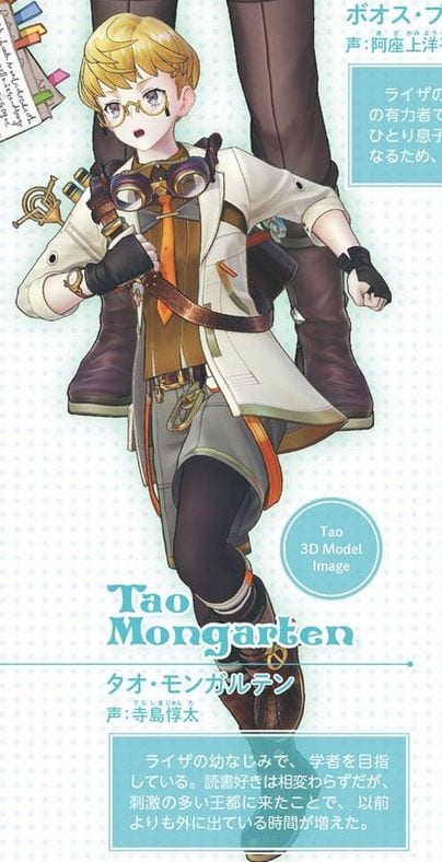 Tao has grown so much that Ryza is surprised when they are finally reunited in the capital. While he still reads a lot, the city atmosphere has inspired him to go out more. He and Bos have traveled to the capital to study following the events of the original game.