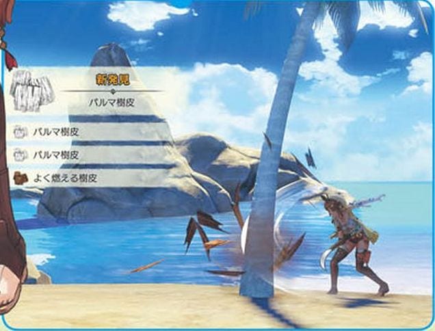 We also get to take a look at gathering. You can gather materials in the field where there are grass, trees, rocks, and more. Ryza can use a variety of gathering tools, and the results change depending on the tools she uses. For instance, trees can yield bark if you use the proper tool.