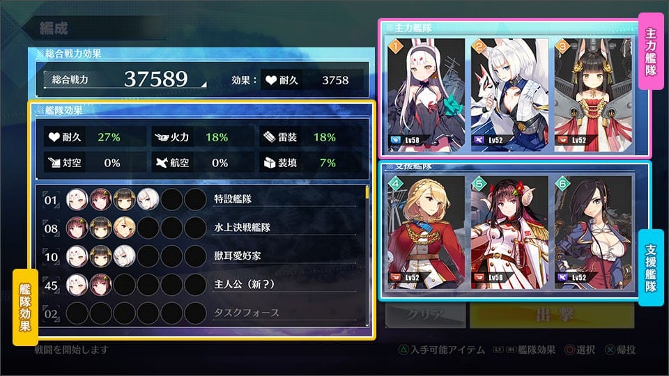For each battle, you select up to three shipgirls for the main fleet and up to three for the support fleet. which will assist the main fleet with skills. If the HP of the main fleet reaches zero, it’s a defeat. Shipgirls in the support fleet won’t get attacked.