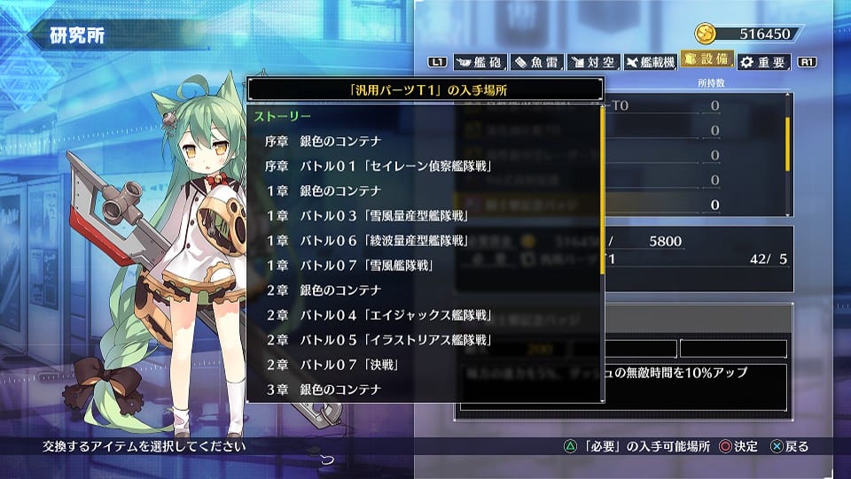 Rare equipment can be obtained on the map, in the post-battle screen, at the research institute, and at Akashi’s shop. Akashi is looking for various items (and headpats, obviously), but if you collect them for her, you may get some extremely valuable gear.