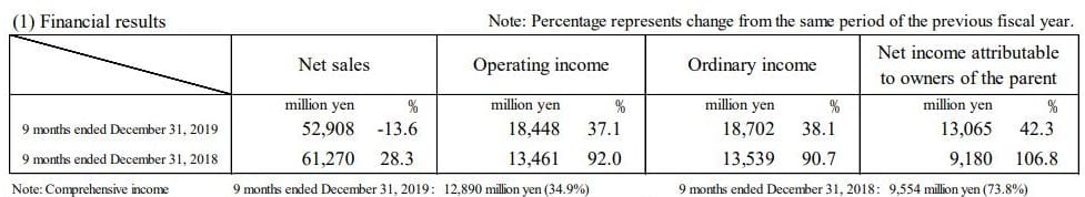 The resulting net sales for the nine months ended December 31, 2019 were 52,908 million yen (down 13.6% from the same term in the previous fiscal year), the decrease due in part to promoting the shift from physical package sales to digital sales.