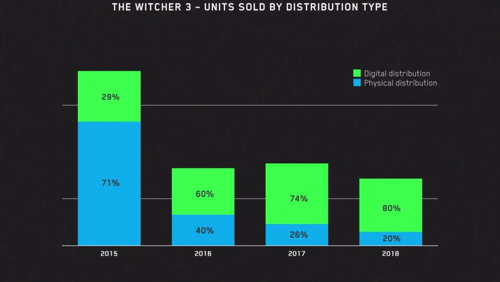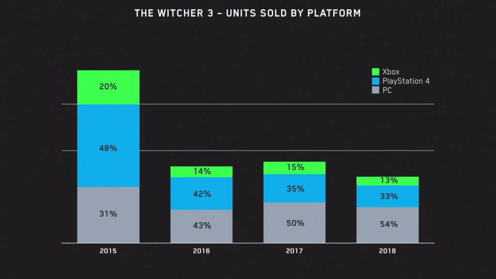 We also get to see a breakdown between digital and physical sales for The Witcher, and between platforms. 80% of sales in 2018 were physical, while 54% were on PC, 33% were on PS4, and 13% were on Xbox One.