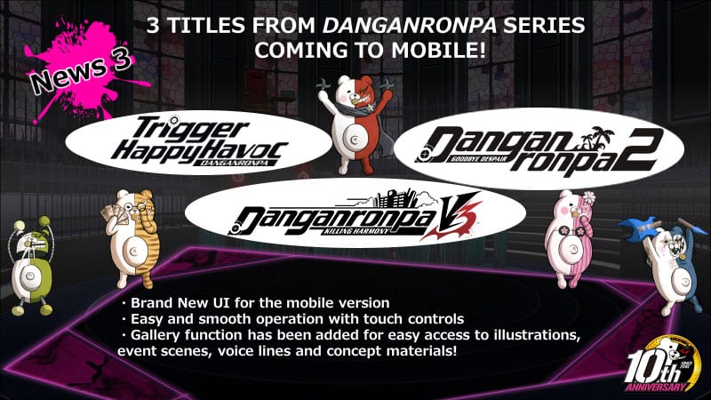 The titles will be Danganronpa: Trigger Happy Havoc Anniversary Edition, Danganronpa 2: Goodbye Despair Anniversary Edition, Danganronpa V3: Killing Harmony Anniversary Edition, and all three are coming for iOS and Android. Pricing and release dates have not been revealed yet.