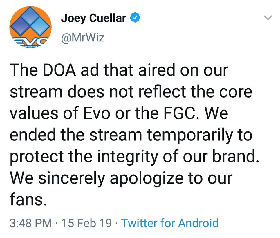 The stream was then suddenly taken offline by EVO’s admins, with a comment from organizer Joey Cuellar, denouncing the display as not reflecting “the core values of EVO or the fighting game community.”