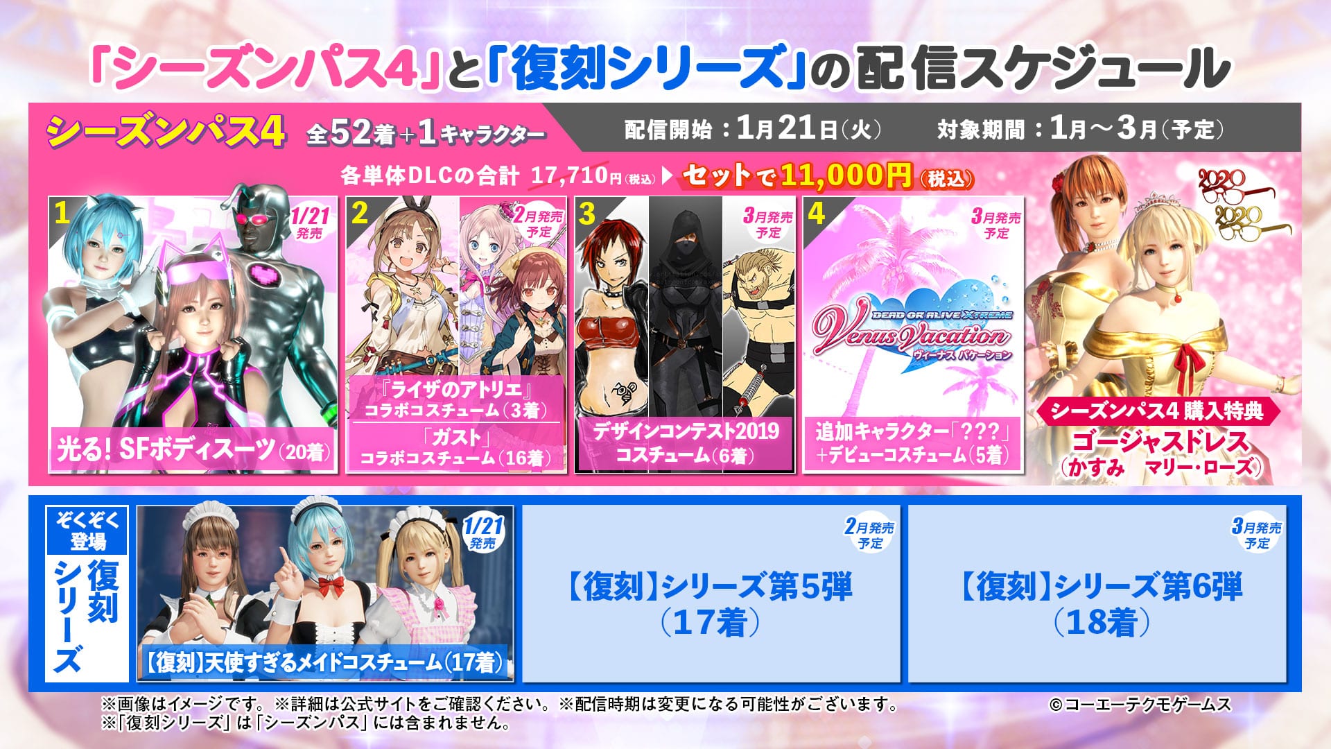 First of all, we learn that the Gust collaboration will launch in February, while the previously-announced character from the growing pool of new heroines created for the free-to-play PC game Dead or Alive Xtreme: Venus Vacation is coming in March.