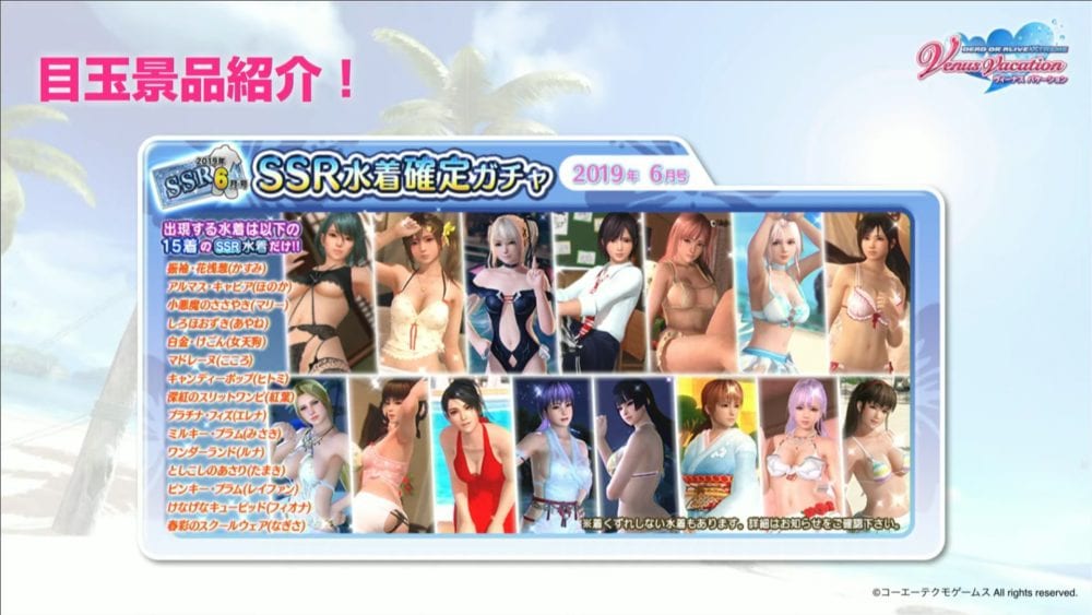 If you’re unfamiliar with Dead or Alive Xtreme: Venus Vacation, it’s a free-to-play version of Dead or Alive Xtreme, available for PC and recently released on Steam with English support. Do keep in mind that the content of this article is related to the Japanese version because the English one is behind by about a year in content.