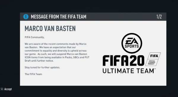 If you booted up FIFA 20 today, you probably encountered a message stating Marco van Basten has been suspended from the game “until further notice.” This probably came as no surprise if you pay close attention to UK sports news.