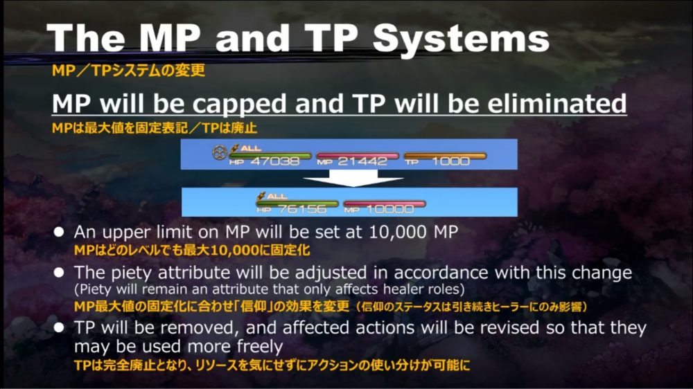 The MP and TP system will be changed as well. MP will be capped to 10,000, while TP will be completely removed. Piety will affect only healers and will increase MP recharge rate.