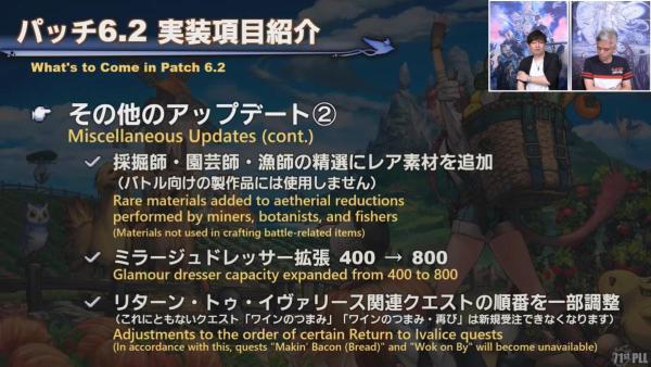 Rare materials will be added to aetherical reductions performed by gatherers (they won’t be used in crafting battle-related items) and the Glamor dresser capacity will be improved from 400 to 800.
