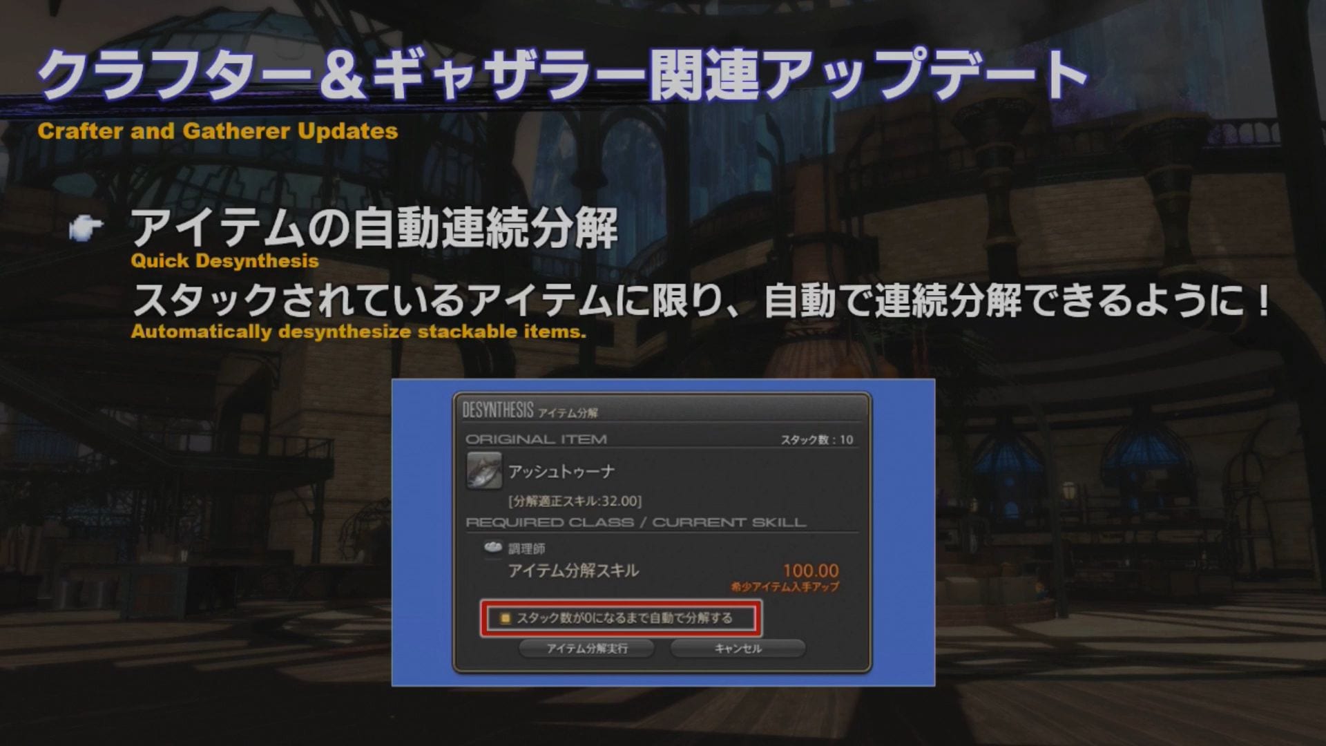 Quick desynthesis will let you automatically desynthesize stackable items. You can see it in action.