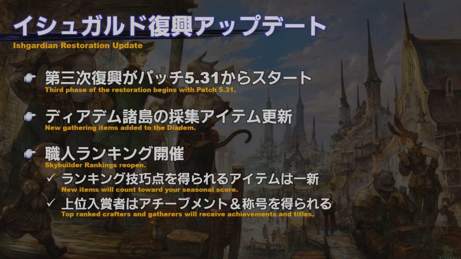 Next we get more info of the new stage of the Ishgard Restoration including new gathering and crafting items, achievements and titles.