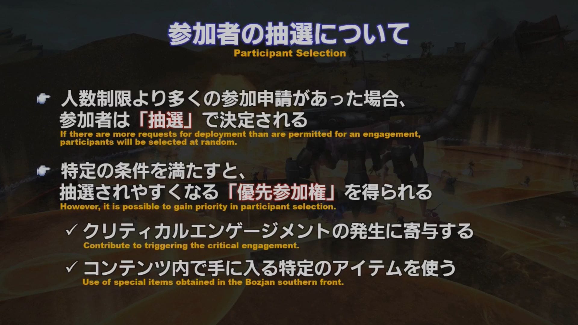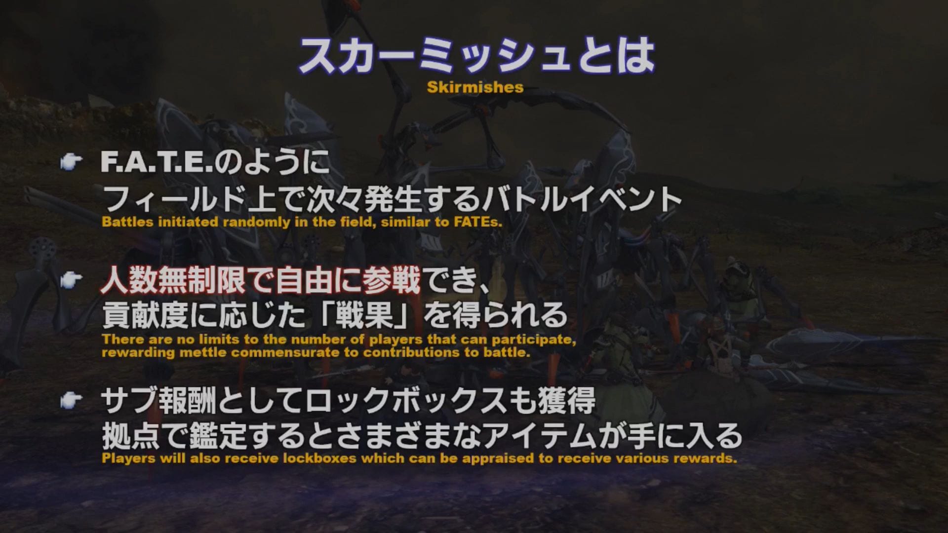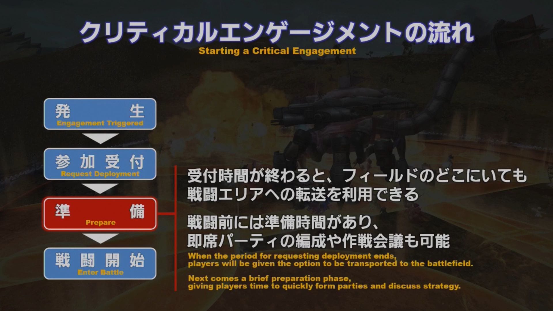 Encounters include Skirmishes and Critical Engagements. The former is similar to FATEs and happen randomly in the field. They will accept an unlimited amount of players and will provide various rewards via lockboxes.