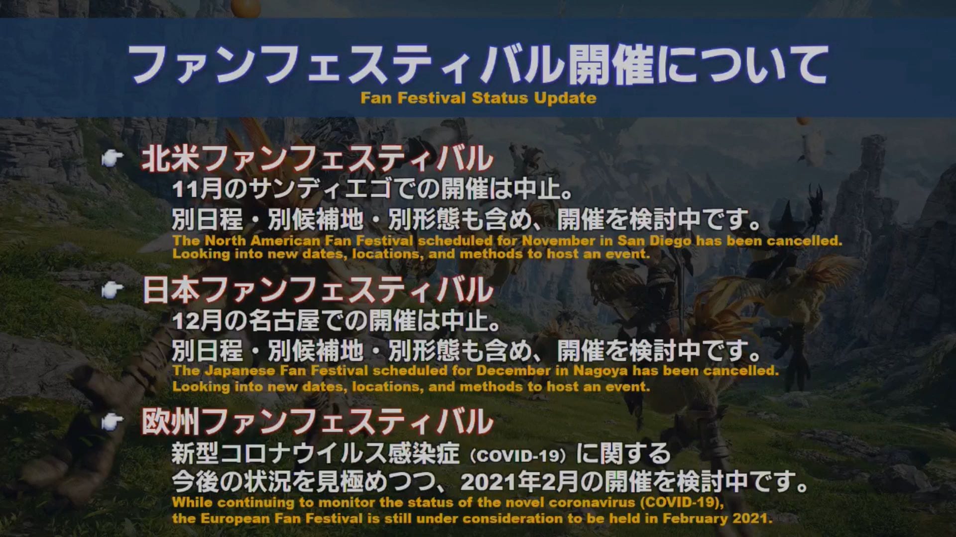 Next, we heard an update for the fan festivals. The Japanese fan-festival in Nagoya has been canceled and Square Enix is looking for new ways (including locations, dates, and methods) to host an event in Japan.