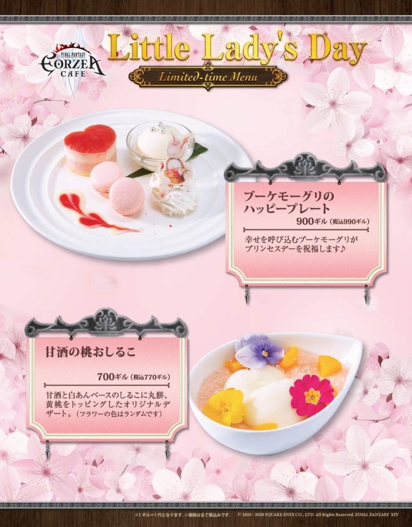 The special dishes include the Bouquet Moogle Happy Plate, the Amazake Peach Oshiruko (Oshiruko is a traditional dessert usually made with azuki beans and mochi, while Amazake is a sweet drink made with rice), and the Il Mehg-style Bouquet Chirashi (Chirashi is a type of richly-decorated sushi)