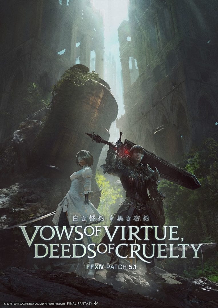First of all, we get the official key artwork of patch 5.1, titled “Vows of Virtue, Deeds of Cruelty;” It features the raid crossing over with Yoko Taro’s NieR: Automata, including the alternate version of YoRHa 2B named “2P” together with the Warrior of Darkness.