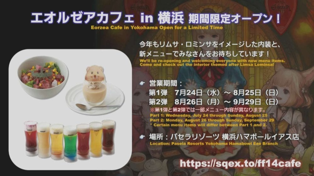 In the slides below you can see a few community announcements including a collaboration with the Square Enix cafe in Akihabara and the reopening of the temporary Eorzea Cafe in Yokohama.