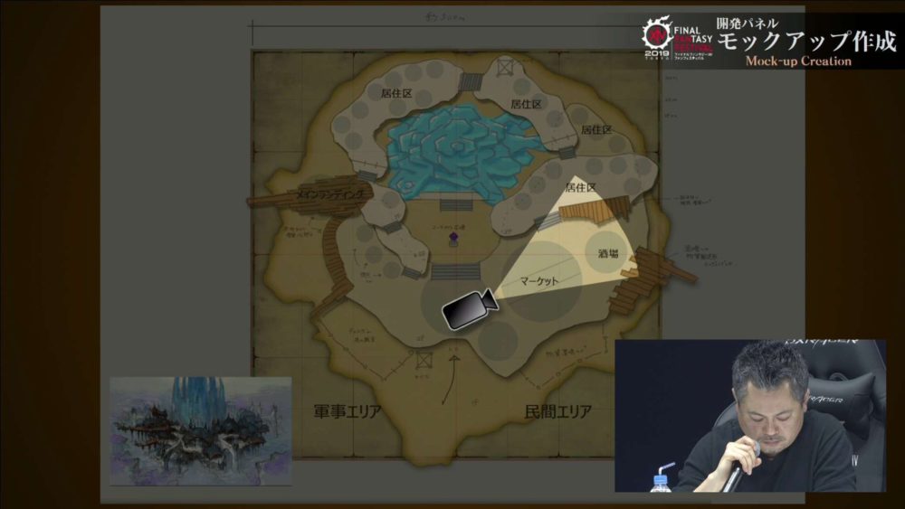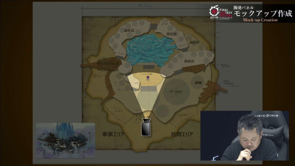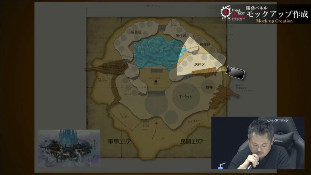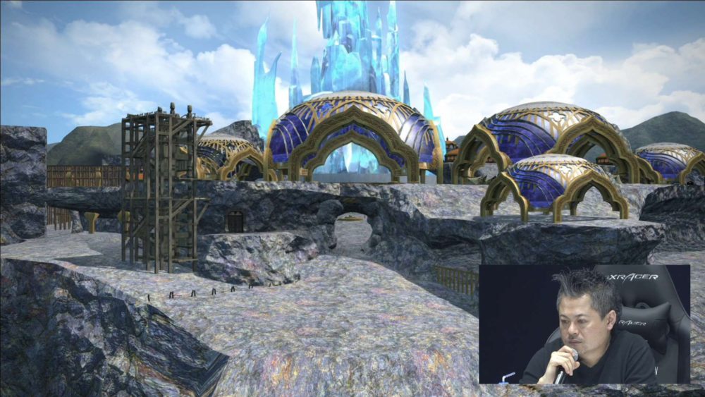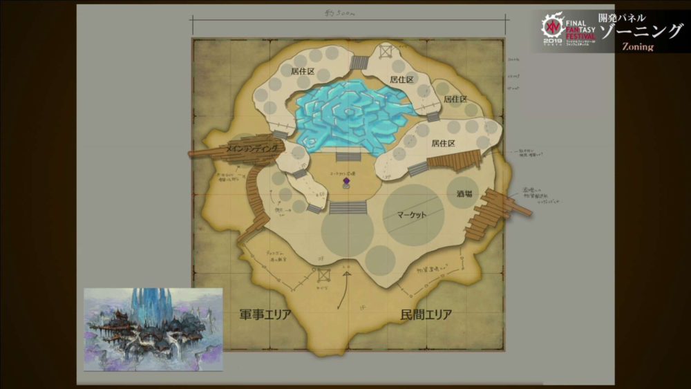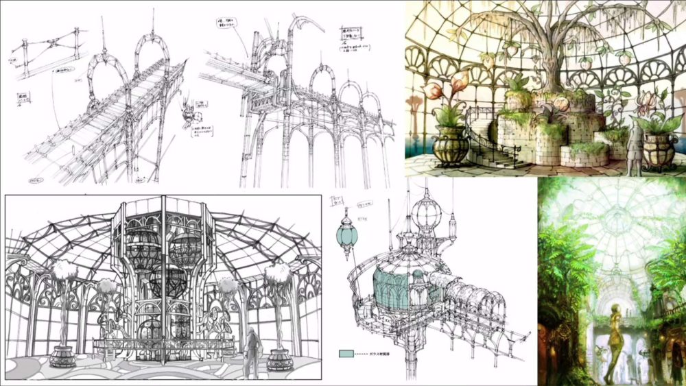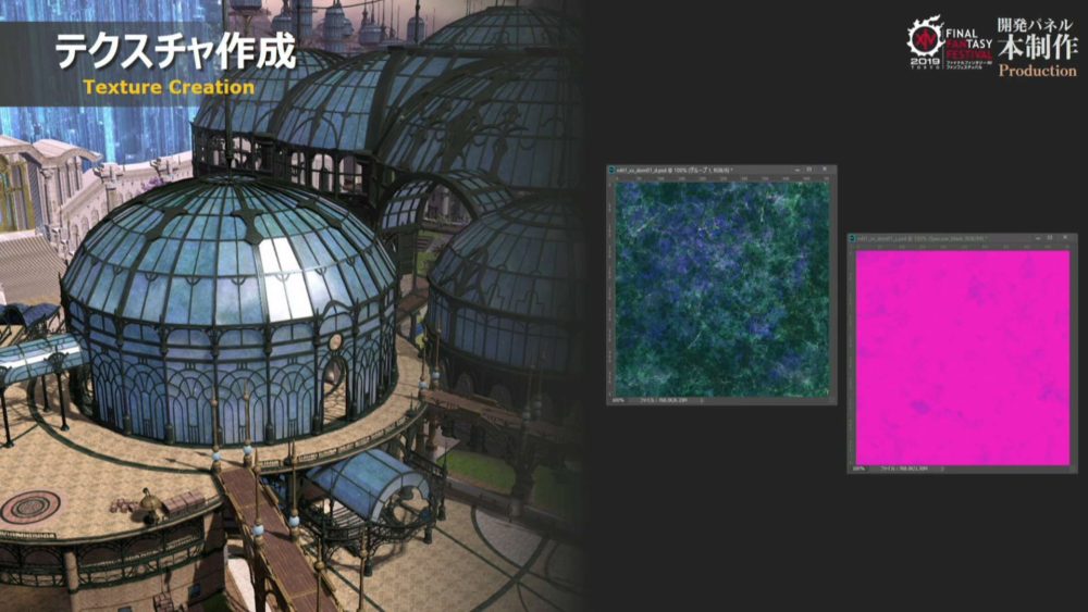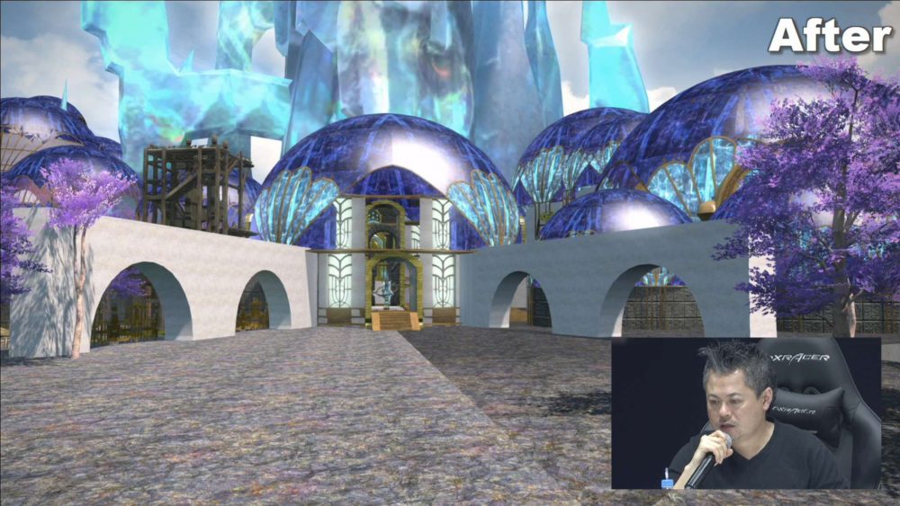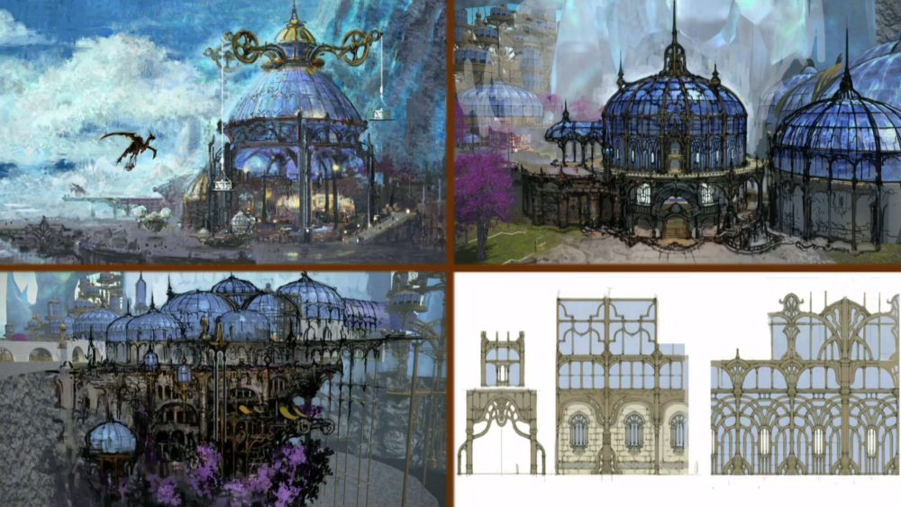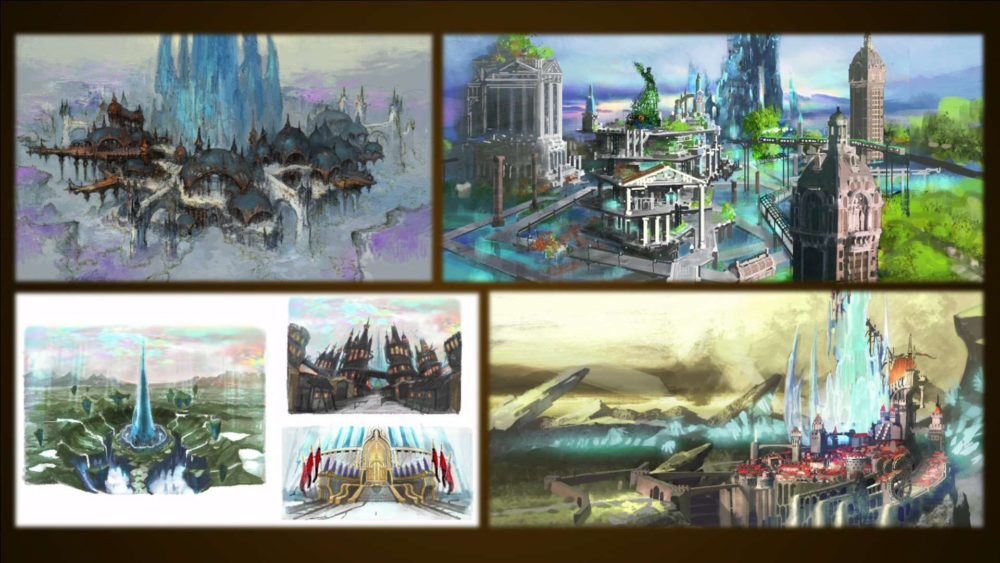 We get to see some really interesting work-in-progress images of the new city named Crystarium that was introduced yesterday, shared by background artists Yoshiki Takanashi and Masato Shida. You can see all the images below in order from the concept art phase to the end of production.