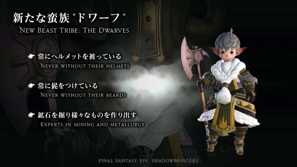 Yoshida-san then presented a new beast tribe, the Dwarfs. In the First, the lalafell actually aren’t the same as in our world. They are Dwarfs, they are a beast tribe and they live in the mountains. Below you can see their looks and and a few screenshots of their villages, which are tiny.