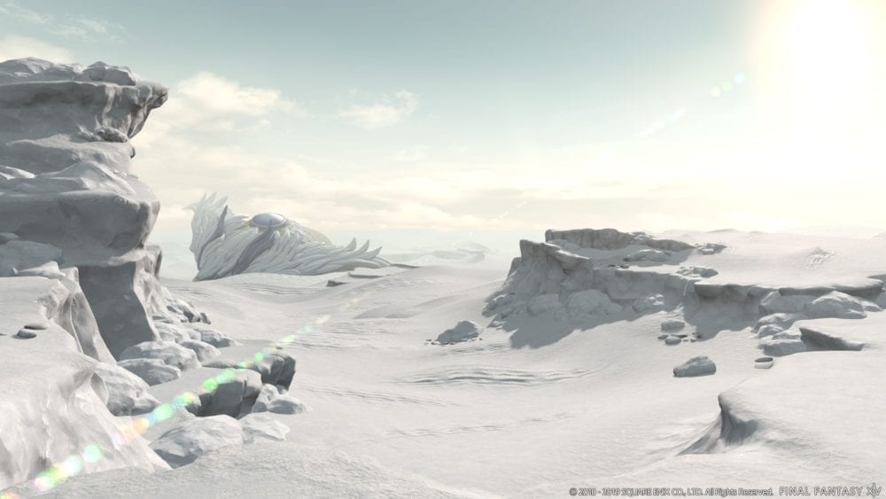 The screenshots showcase everyone’s beloved derplander in his new Warrior of Darkness guise riding some sort of vehicles alongside Thancred and Urianger. We also get to take a look at the barren landscape of Eden, save for a rather familiar silhouette in the background.