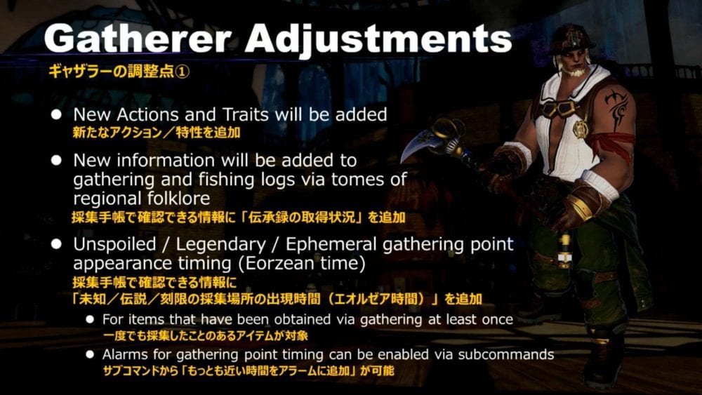 New information will be added to gathering and fishing logs via tomes and regional folklore. Alarms will be added to help people take advantage of unspoiled, legendary, and ephemeral gathering points.