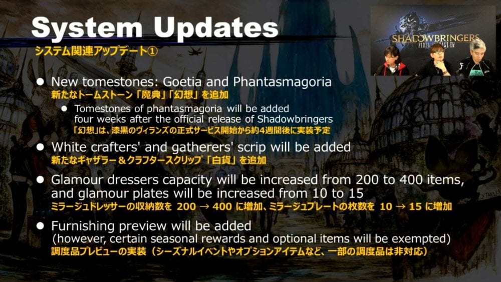 White scrips will be added for crafters and gatherers. Glamor dressers will get their capacity increased to 400 (from 200). Glamour plates will be increased from 10 to 15. A furnishing preview feature will be added.