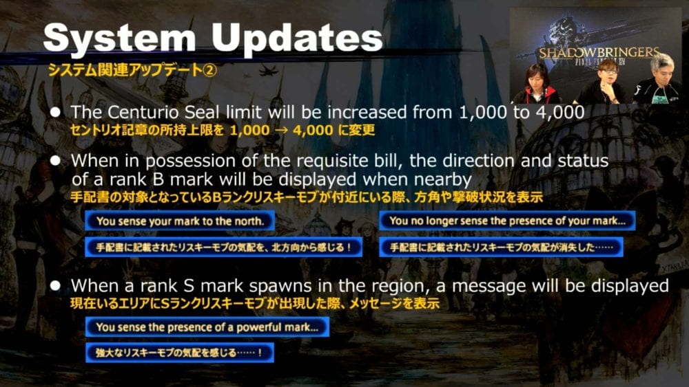 The centurio seal limit will be increased to 4,000 (from 1,000). In hunts, when you have the right bill for a B-rank you’ll have a display of the direction of your mark. A message will also be displayed when an S-rank spawns in the region you’re in. There will be a surprise bound to an S-rank.