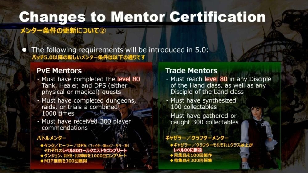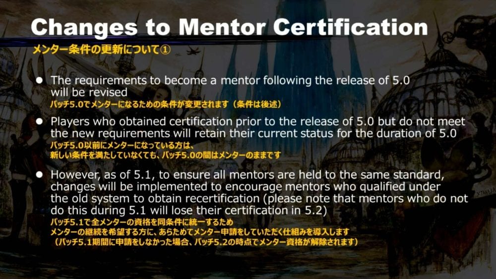 The requirements to become mentors will be updated, and to ensure that all mentors are held to the same standards, you’ll need to obtain certification again as of patch 5.1 as legacy mentors status will be wiped.