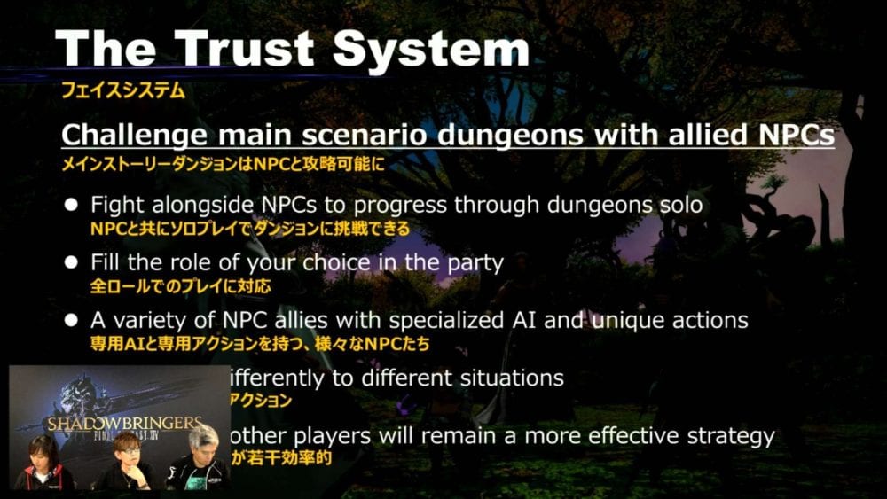 We finally get an extensive look at the Trust system, which allows players to challenge main scenario dungeons with allied NPCs. This allows solo players to progress on their own while filling the role they prefer in the party.