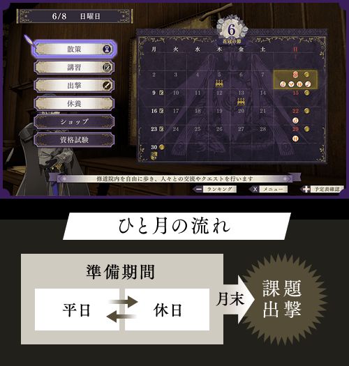 Weekdays are dedicated to educating the students towards their class change exams. On holidays you can interact with the people at the academy, do more studying, or even fight battles. How to spend time in preparation of each exam is up to the player.
