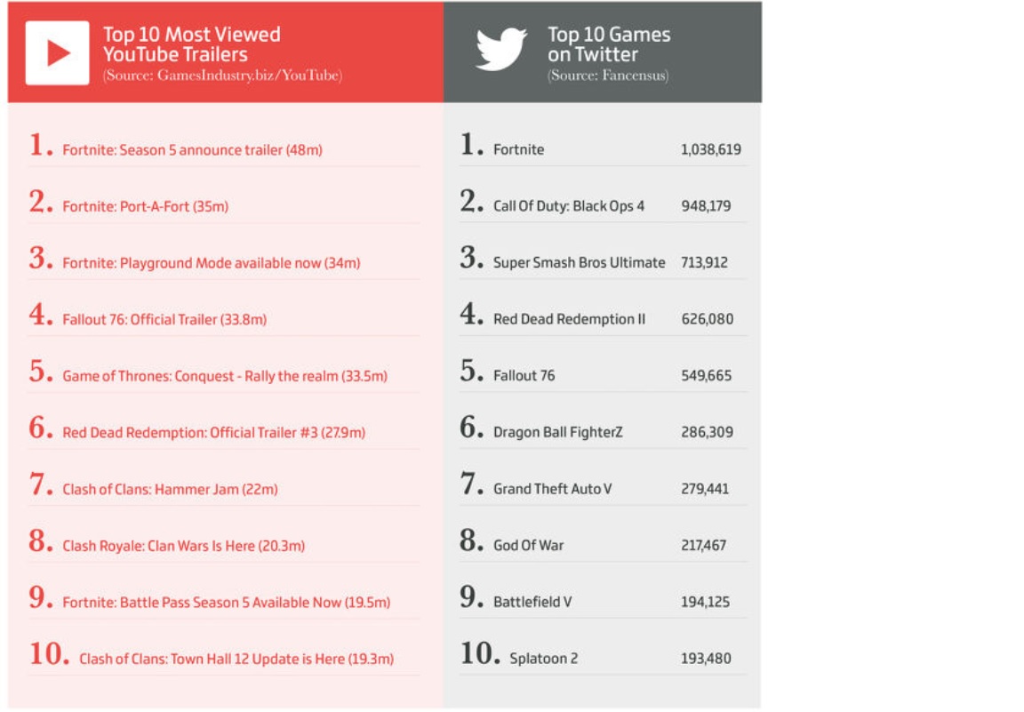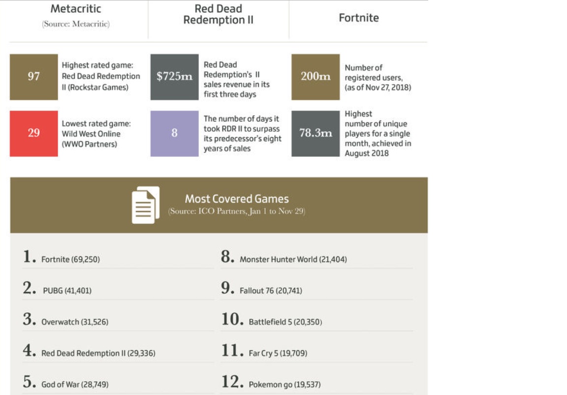 Fortnite achieved 200 million registered players over the year, smashing its concurrent record in the process which saw 78.3 million players on servers at the same time. It was also the most-covered game of the year and the top three most-watched YouTube trailers were all newly released features for the game in 2018.