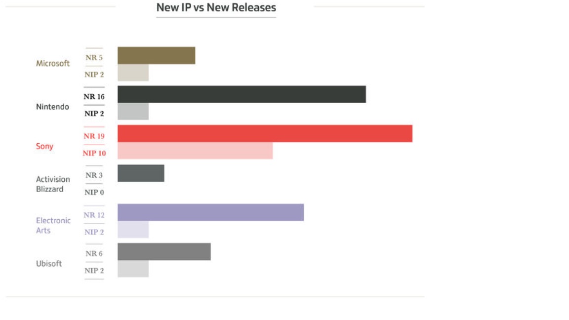 As for breakdowns categorized by platform, Sony’s PS4 led the publisher spoils with the highest number of new releases and new IPs launched in 2018, with Nintendo following close behind.