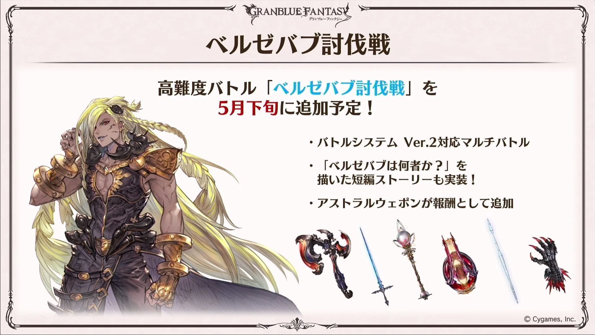May will see another collaboration with The Idolmaster: Cinderella Girls and a raid focusing on Beelzebub trying in with Granblue Fantasy versus, including story content. Incidentally, it will feature the brand new battle system 2.0.