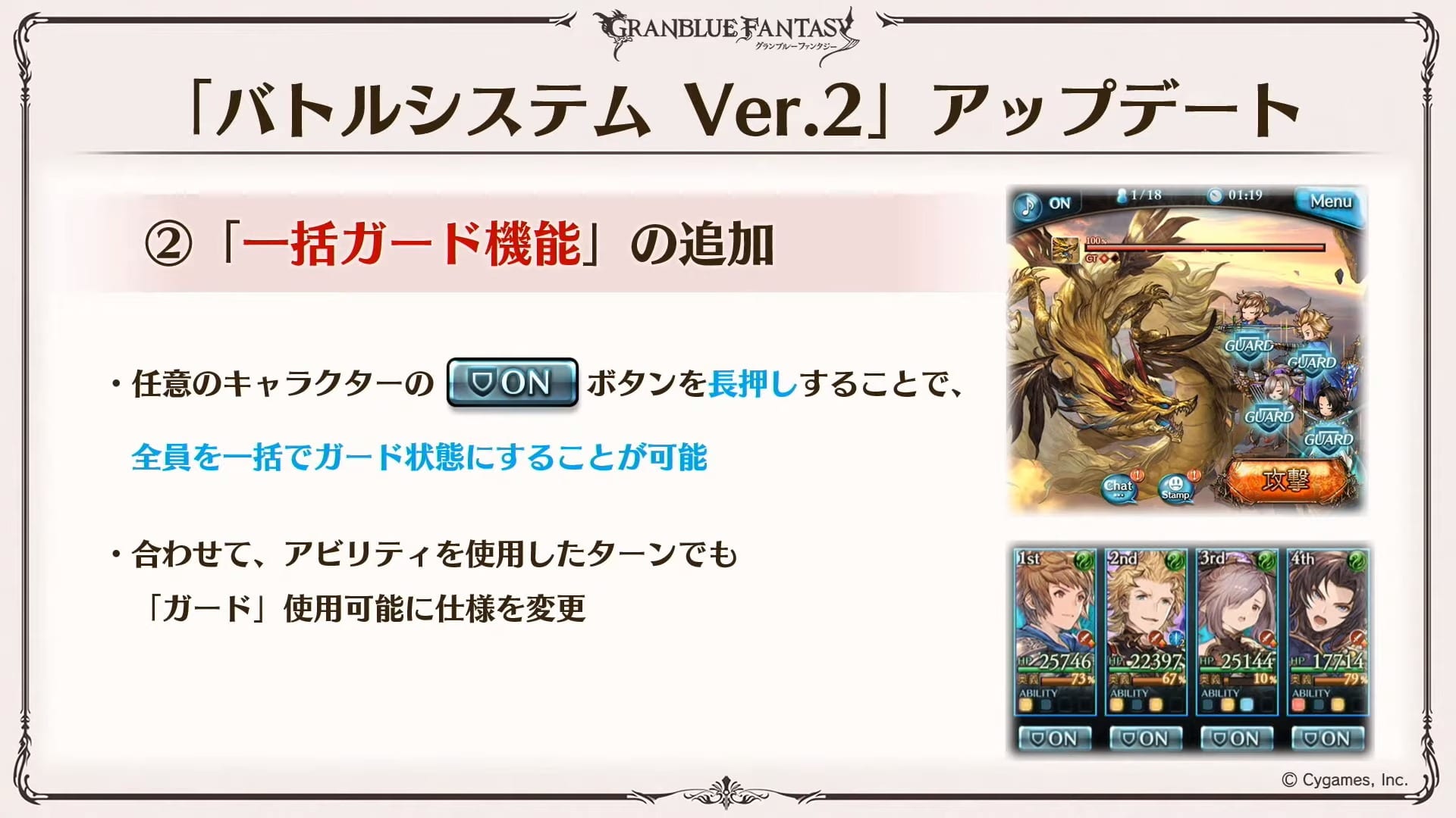 More battle system V2 changes have been announced including the fact that Chain Burst will become Fatal Chain and will be something you unleash when you feel appropriate. A Guard All feature will be added and Omen will apply at the end of turns.
