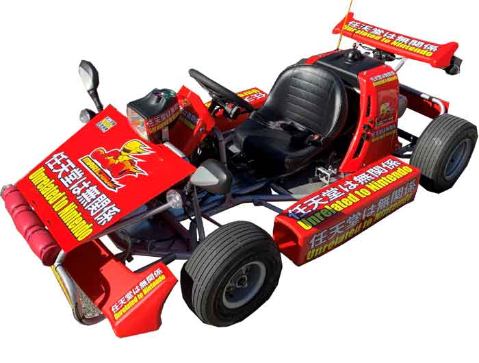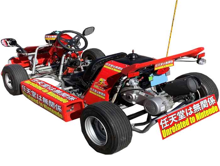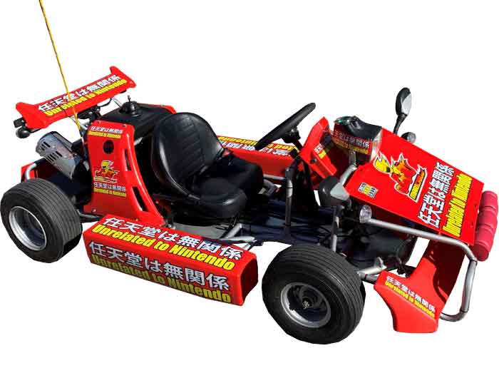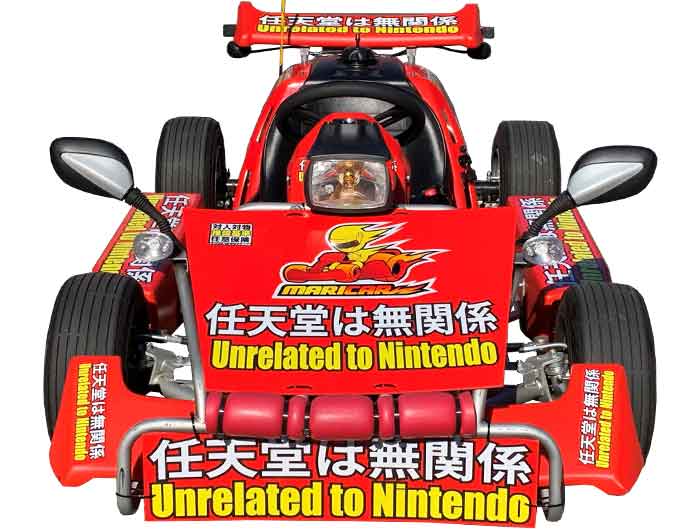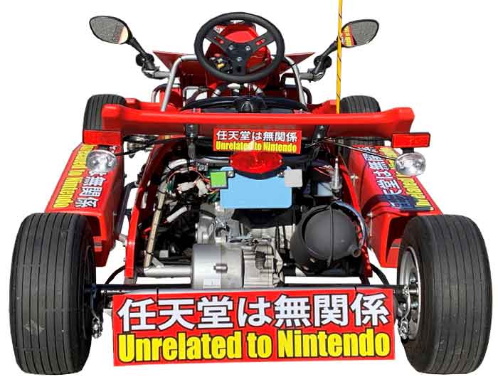 While the whimsical costumes worn by riders aren’t related to Nintendo and Mario Kart anymore, the karts themselves state that fact very evidently, over basically every usable surface, both in Japanese and English.
